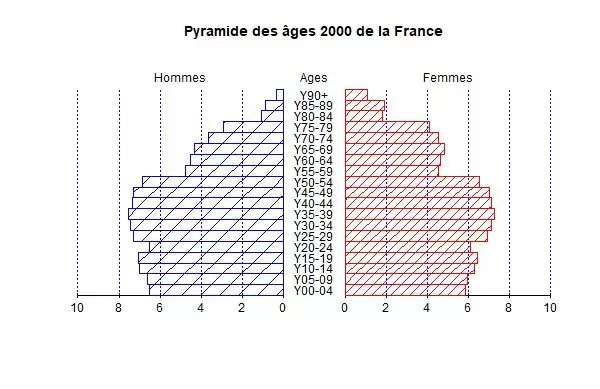 Este aumento del número de muertes no es un signo de que la salud de los franceses se esté deteriorando, sino sólo el resultado del aumento del número de personas mayores. De hecho, a medida que envejecemos, todos los humanos acaban muriendo. Para ilustrarlo, he aquí la pirámide de edad de Francia en 2000 y en 2020, realizada con los datos disponibles en Eurostat.