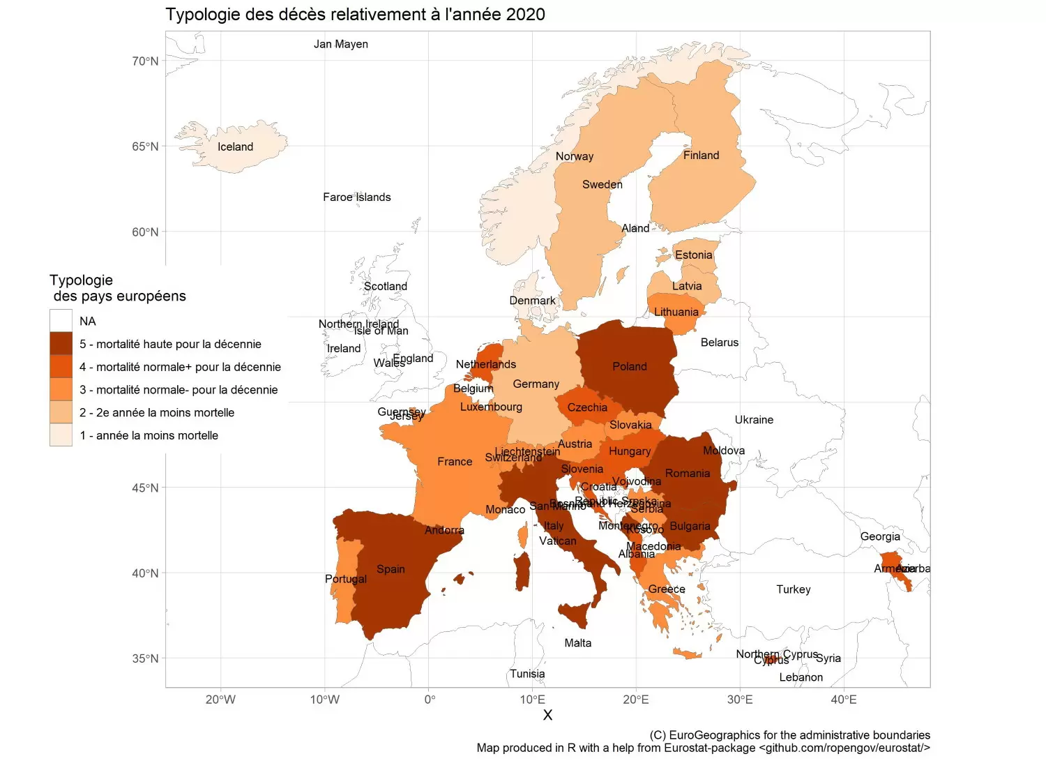 En marron, nous retrouvons tous les pays pour lesquels l’année 2020 est l’année pour laquelle il y a eu le plus de décès. C’est bien le cas de la majorité des pays d’Europe. On note toutefois quelques exceptions, en particulier les pays nordiques. Cette carte est réalisée avec des données brutes. Comme nous l’avons vu pour la France, les données brutes reflètent avant tout l’augmentation et le vieillissement de la population.