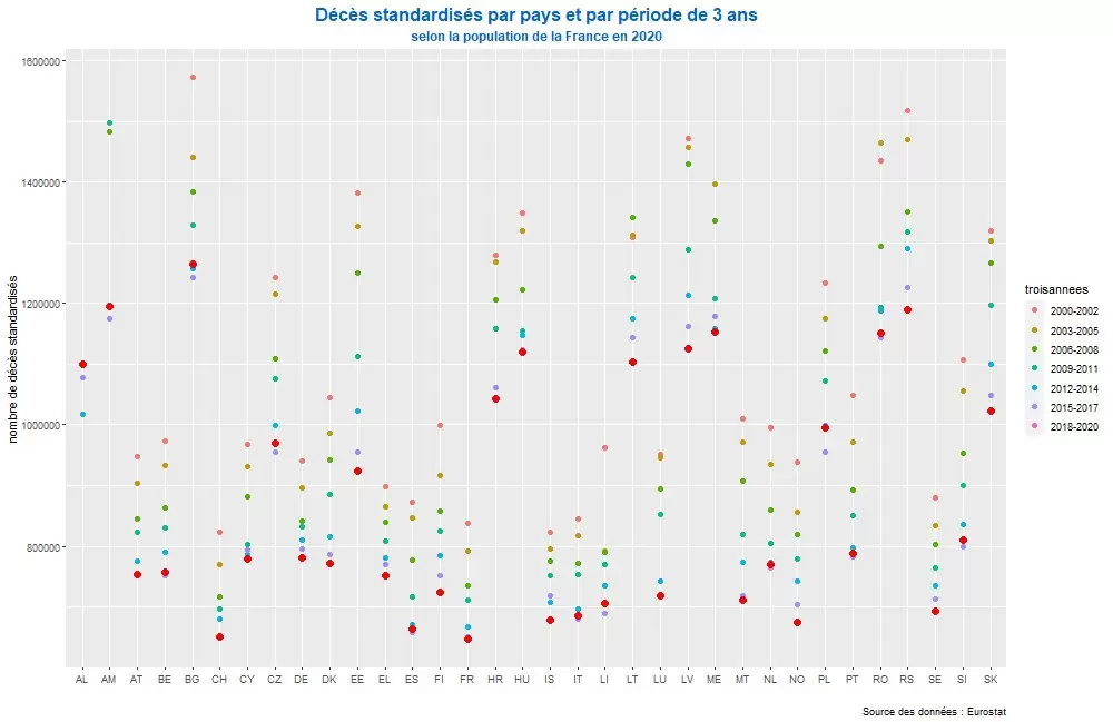 Los datos sobre las muertes por todas las causas son, sorprendentemente y por desgracia, mucho más difíciles de encontrar. Sólo cabe sorprenderse de que no se beneficien de la difusión de las estadísticas de Covid y sus numerosos sitios web redoblando las interfaces gráficas. Hay que descargarlos de sitios especializados y retocarlos para que sean utilizables. Sin embargo, son los únicos que permiten un análisis objetivo de la situación. Sin embargo, sería "suficiente" que sitios como Ourworldindata se "conectaran" a sitios oficiales de depósito de datos estadísticos como Eurostat para proponer gráficos y animaciones que iluminen el debate sobre muchos temas. Eurostat ofrece incluso una interfaz de programación de aplicaciones (API) que permite a cualquiera descargar y utilizar cualquier base de datos.