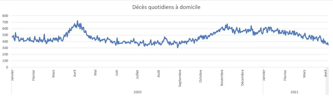 Las patologías no tratadas a causa de la orden de no consultar al médico y de permanecer en casa, así como el pánico generado por la presión mediática diaria, pueden explicar el exceso de mortalidad en casa en Francia durante este periodo, como se detalla en la página web del INSEE 9. Se considera que estas muertes no tienen ninguna relación con Covid-19. Sin embargo, aparecen en los mismos períodos que los atribuidos a esta enfermedad.