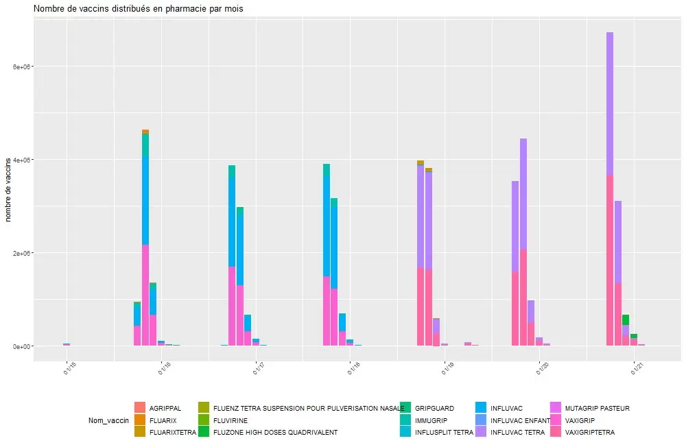 Este gráfico representa la base reembolsable de todos los medicamentos vendidos por las farmacias en Francia, cada mes.