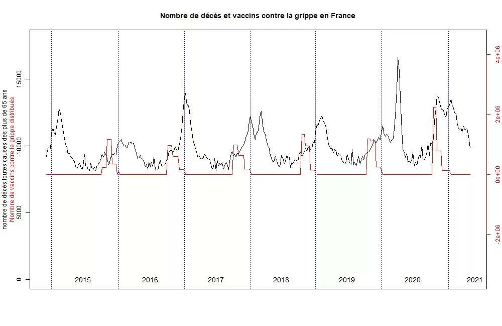 Está abierto el debate sobre la utilidad real de la vacuna antigripal en la mortalidad invernal. Recordemos que esta vacuna no está diseñada como las demás. Es una mezcla que contiene varias cepas de la gripe recomendadas por la OMS. En el momento de la recomendación, no hay ninguna certeza sobre las cepas que circularán durante el invierno. Por lo tanto, es una apuesta. Algunos países, como Noruega y Finlandia, tienen una distribución más baja que otros, especialmente desde la polémica que siguió a la campaña de vacunación contra el H1N1. Sin embargo, Noruega y Finlandia no parecen haber experimentado picos de muertes invernales en los últimos años, sino todo lo contrario. Los datos disponibles sobre las vacunas sólo están disponibles mensualmente, lo que no permite una comparación de calidad con las muertes en Francia. Un alisado semanal de las vacunas distribuidas en comparación con las muertes por todas las causas de las personas mayores de 65 años en Francia (la población más vacunada debido a que las vacunas son gratuitas a esta edad), muestra una proximidad entre estos 2 eventos.