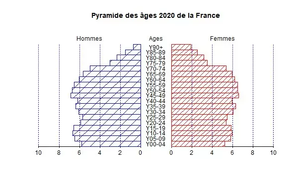 Este aumento del número de muertes no es un signo de que la salud de los franceses se esté deteriorando, sino sólo el resultado del aumento del número de personas mayores. De hecho, a medida que envejecemos, todos los humanos acaban muriendo. Para ilustrarlo, he aquí la pirámide de edad de Francia en 2000 y en 2020, realizada con los datos disponibles en Eurostat.