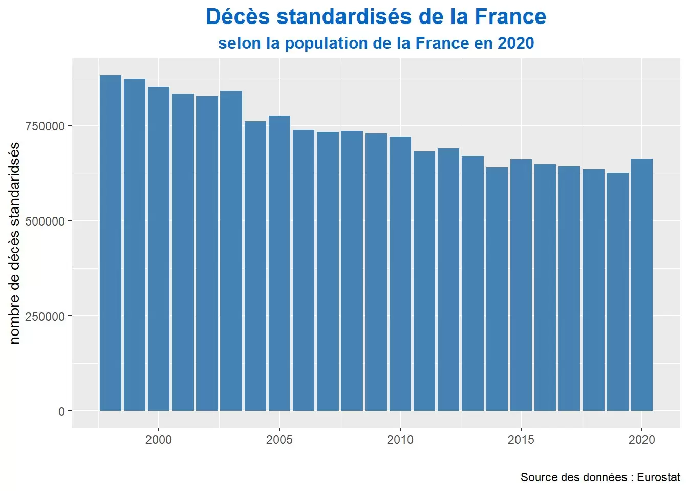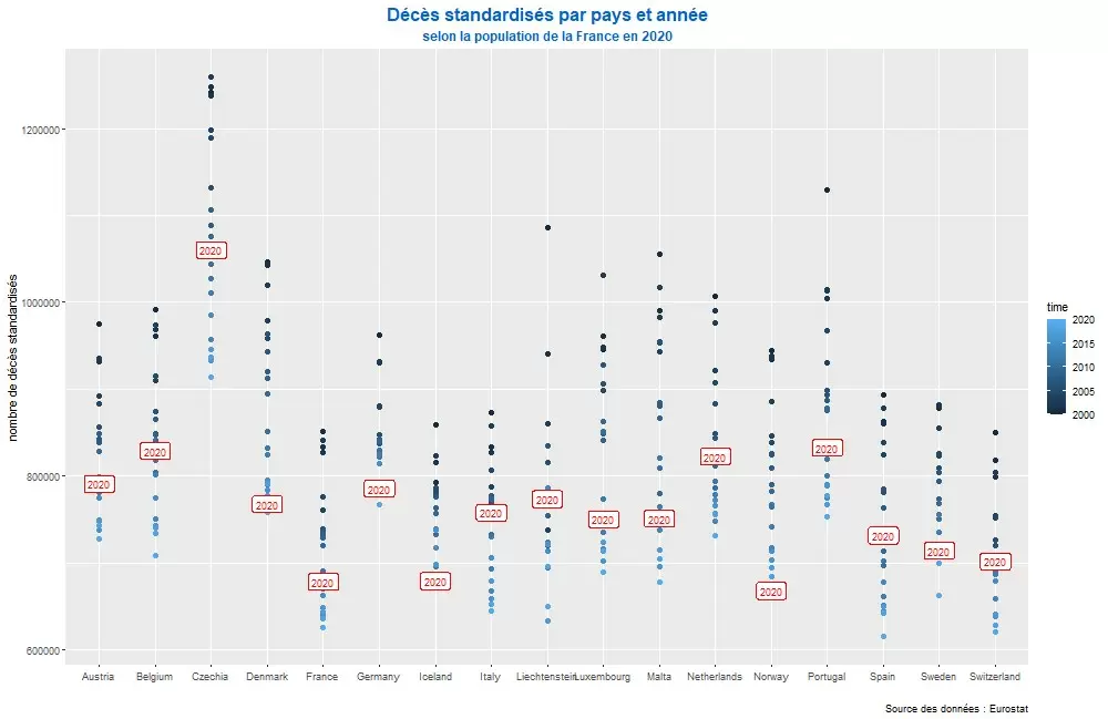 Para comparar el número de defunciones en Francia en los últimos años con el año 2020, estandarizamos las defunciones aplicando la población por edad de 2020 a todos los años del pasado. Esto demostró que el año 2020 no es en absoluto un año récord de muertes.