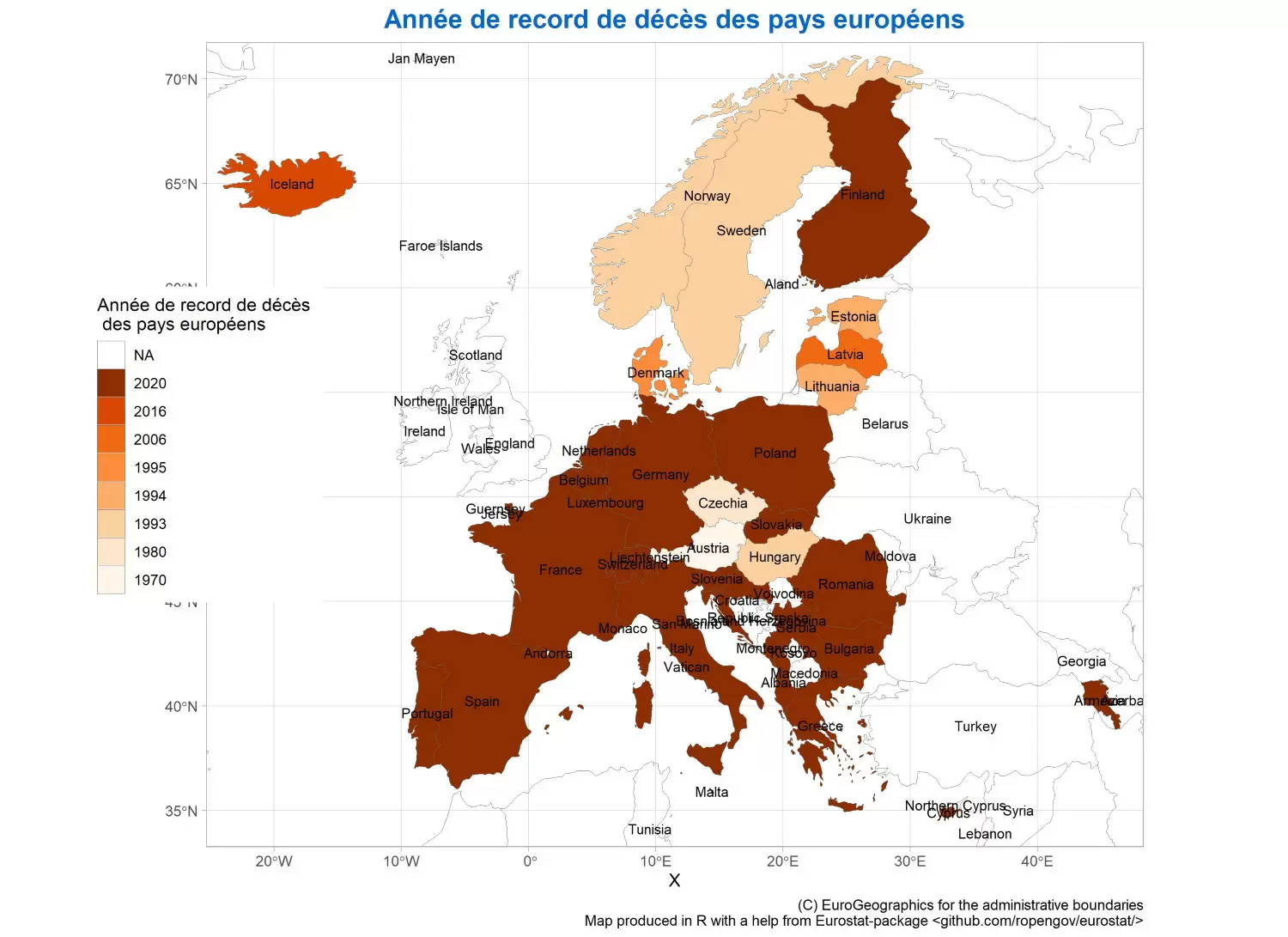 La mayoría de los países europeos, incluida Francia, experimentaron un 2020 dentro de la norma de la década. Los países de color naranja claro tienen más probabilidades de estar en la segunda mitad de la década, en torno a 2015-2016. Los países en naranja oscuro son más frecuentes en torno al año 2012.