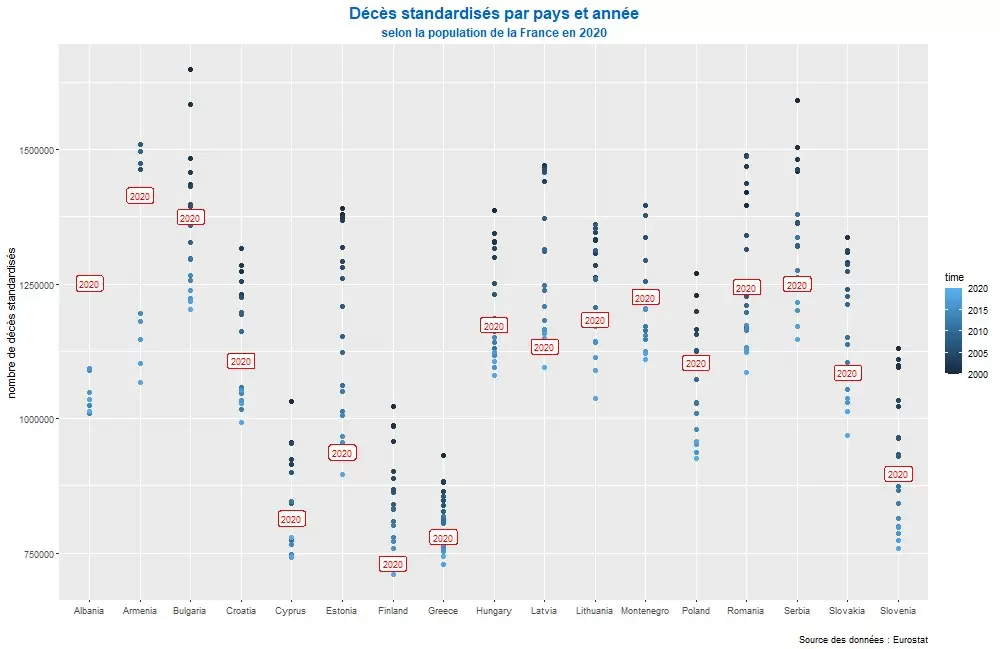 Los datos sobre las muertes por todas las causas son, sorprendentemente y por desgracia, mucho más difíciles de encontrar. Sólo cabe sorprenderse de que no se beneficien de la difusión de las estadísticas de Covid y sus numerosos sitios web redoblando las interfaces gráficas. Hay que descargarlos de sitios especializados y retocarlos para que sean utilizables. Sin embargo, son los únicos que permiten un análisis objetivo de la situación. Sin embargo, sería "suficiente" que sitios como Ourworldindata se "conectaran" a sitios oficiales de depósito de datos estadísticos como Eurostat para proponer gráficos y animaciones que iluminen el debate sobre muchos temas. Eurostat ofrece incluso una interfaz de programación de aplicaciones (API) que permite a cualquiera descargar y utilizar cualquier base de datos.
