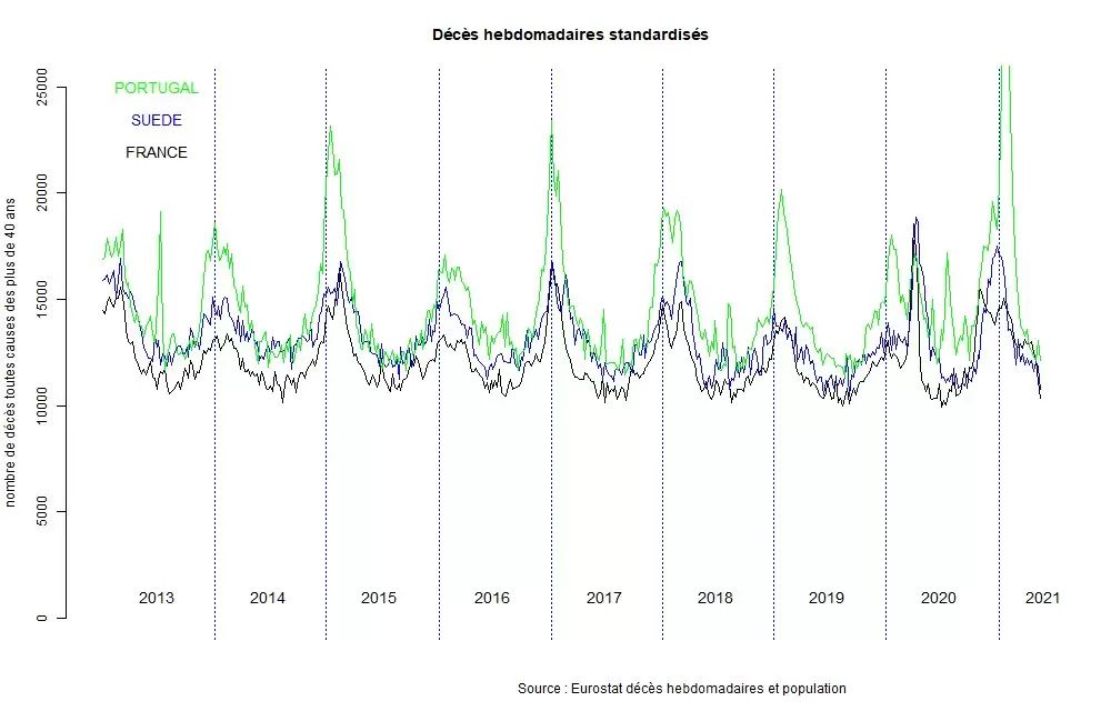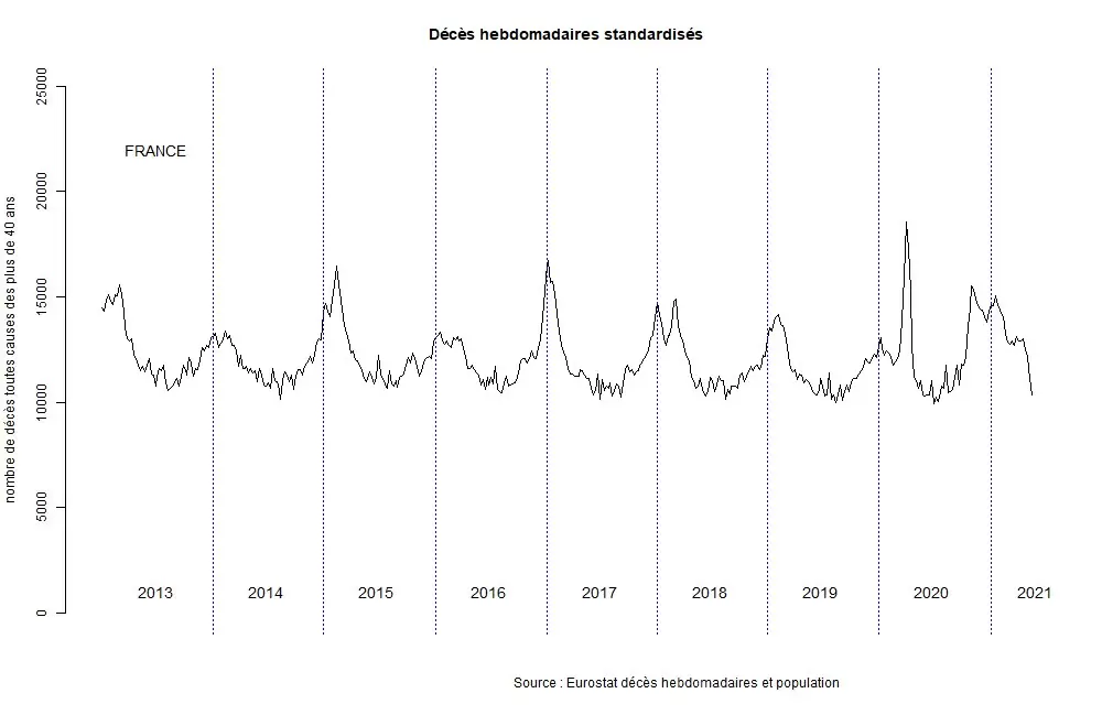 No es excepcional que en torno al 1 de enero de cada año se produzcan dos periodos de aumento visible de la mortalidad. Este fue especialmente el caso de Francia durante el invierno de 2017-2018. Sin embargo, estos periodos suelen estar muy próximos en el tiempo. En 2021, para algunos países, el segundo pico de mortalidad está muy lejos del primero. Por primera vez, en 2021, se ha decidido una política sanitaria de un alcance sin precedentes, basada en vacunas experimentales sobre las que no se dispone de información retrospectiva. Esta disponibilidad también está siendo controlada a una escala sin precedentes. Muchos países están enviando sus datos de vacunación casi directamente. Es difícil hacerse una idea precisa de la calidad de la retroalimentación de datos, pero ofrece posibilidades de comparación sin precedentes.