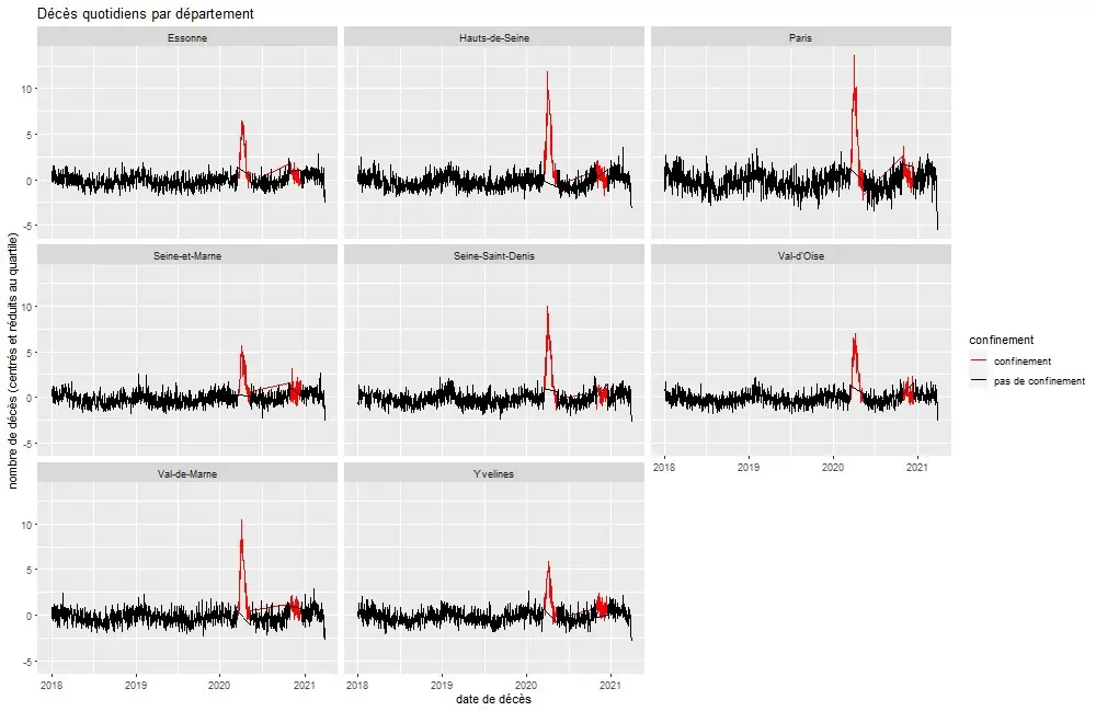 En la región de Île-de-France, por ejemplo, todos los departamentos experimentan un aumento sincronizado de la mortalidad a partir del inicio de la contención identificada aquí en azul.
