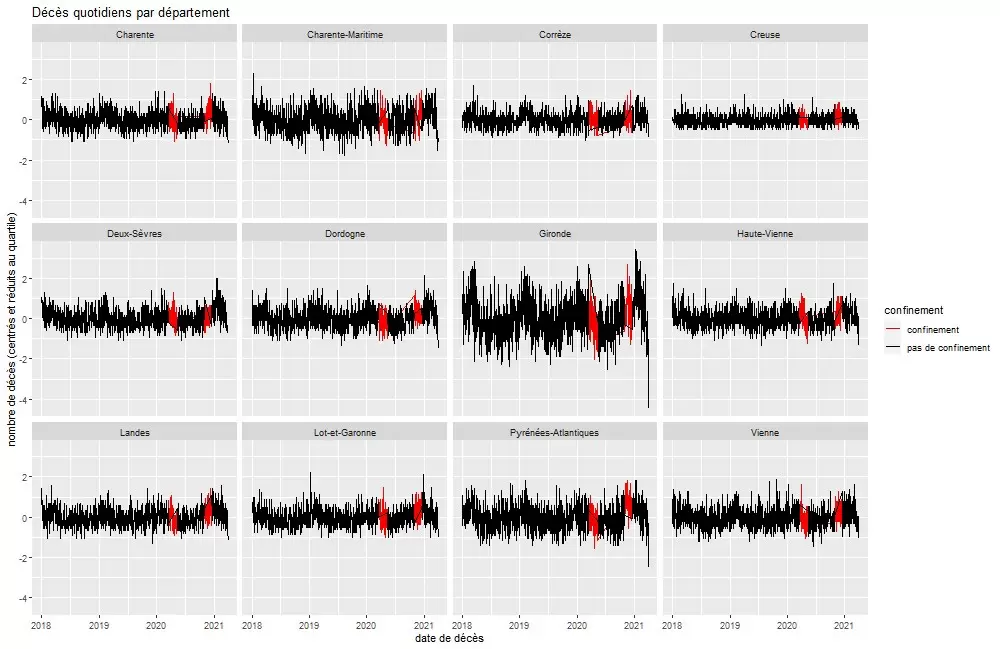 A nivel de los departamentos franceses, el pico de mortalidad de marzo-abril de 2020 no afectó a todos los territorios, ni con la misma intensidad para todos los territorios afectados. Por otro lado, todos los territorios afectados por este pico de mortalidad se vieron afectados de forma sincronizada. Por lo tanto, tenemos un pico de mortalidad que no afecta a todos los países europeos, y dentro de cada país, no a todos los territorios, pero sí a todos los territorios afectados al mismo tiempo.