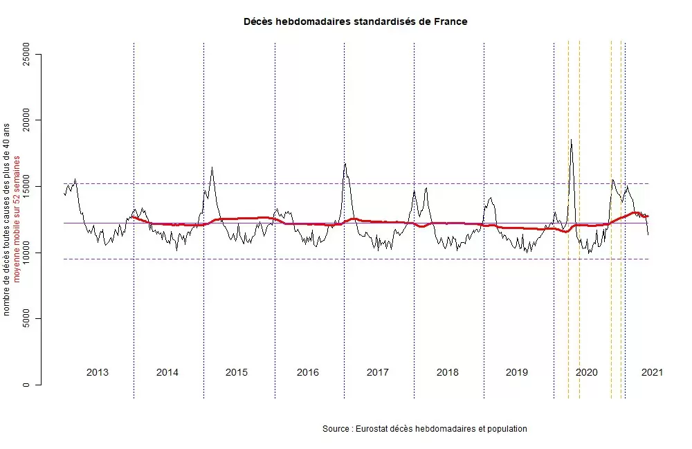 Todos los datos de mortalidad utilizados en este artículo son datos de mortalidad por todas las causas y no sólo datos de mortalidad por la única causa Covid-19. En efecto, para considerar que una enfermedad es mortal, debe tener un impacto en la mortalidad general, y no contar sólo las muertes de las personas portadoras. Todo el mundo estará de acuerdo en que no tendría sentido estadístico contar las muertes que se produjeron después de comer helado de vainilla. Sin embargo, si lo hiciéramos, veríamos un fuerte aumento de estas muertes en verano, simplemente porque en Francia mueren 1.500 personas cada día en verano, y durante este periodo se come helado de vainilla con más frecuencia. Esto es lo que se conoce como un sesgo de percepción.