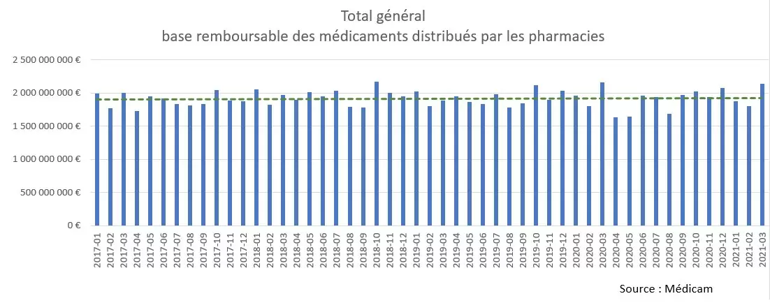 Este gráfico representa la base reembolsable de todos los medicamentos vendidos por las farmacias en Francia, cada mes.