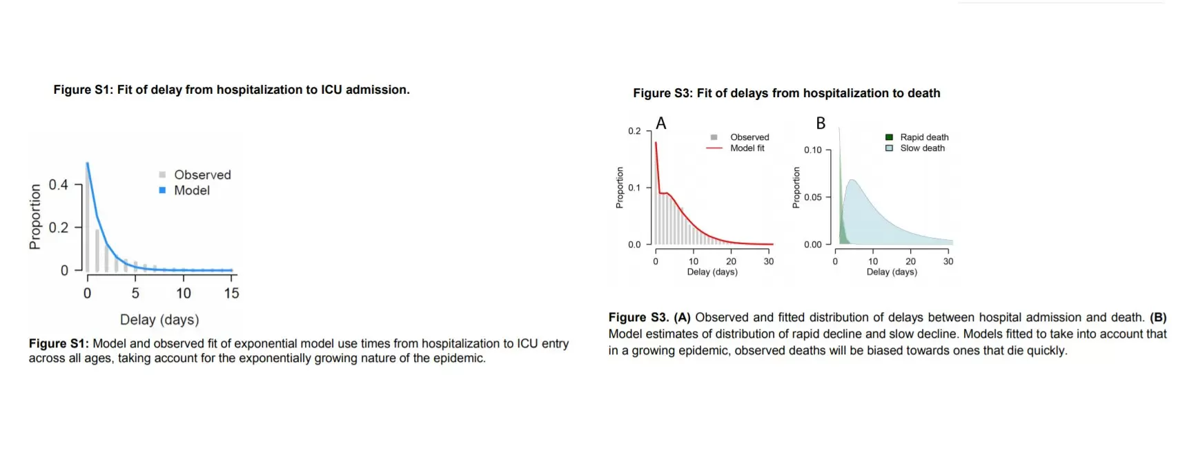 Esta falta de gestión ha sido cuantificada por los dos miembros del Consejo Científico, Arnaud Fontanet y Simon Cauchemez, que están en el origen de esta estrategia. Su artículo, publicado en Science 10, utiliza datos de hospitales franceses y, en particular, el tiempo de paso y reanimación y de muerte desde que el paciente se hizo cargo. Las curvas más interesantes se han eliminado del artículo principal, pero siguen estando disponibles en los datos adicionales. En las páginas 15 y 16 se detalla el número de días que los pacientes que llegan al hospital tardan en pasar a cuidados intensivos (gráfico de la izquierda) y el número de días que tardan en morir (gráfico de la derecha).