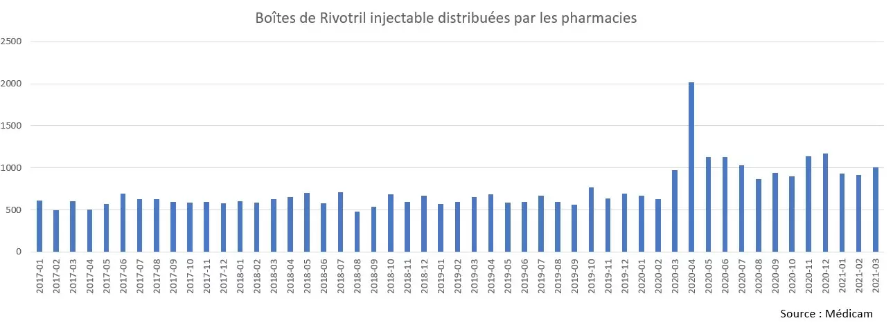 Así, a diferencia de los antibióticos, las ventas de cajas de Rivotril en forma inyectable aumentaron un 59% en marzo y un 227% en abril en relación con la media observada entre 2017 y 2019. Este aumento con respecto a marzo-abril representa 1.700 cajas del producto y más de lo habitual. Hay que tener en cuenta que cada caja contiene 6 ampollas, de las cuales se utilizan de una a dos por paciente en un entorno de EOL. Estas estadísticas sólo reflejan parcialmente el uso de esta molécula, ya que no tienen en cuenta las dosis que no son distribuidas por las farmacias de la ciudad, por ejemplo, directamente desde el hospital. Es sorprendente que el consumo de este producto en su forma inyectable no haya vuelto a su nivel anterior. Entre marzo de 2020 y marzo de 2021, se vendieron otras 6.150 cajas, es decir, más de 36.000 ampollas.