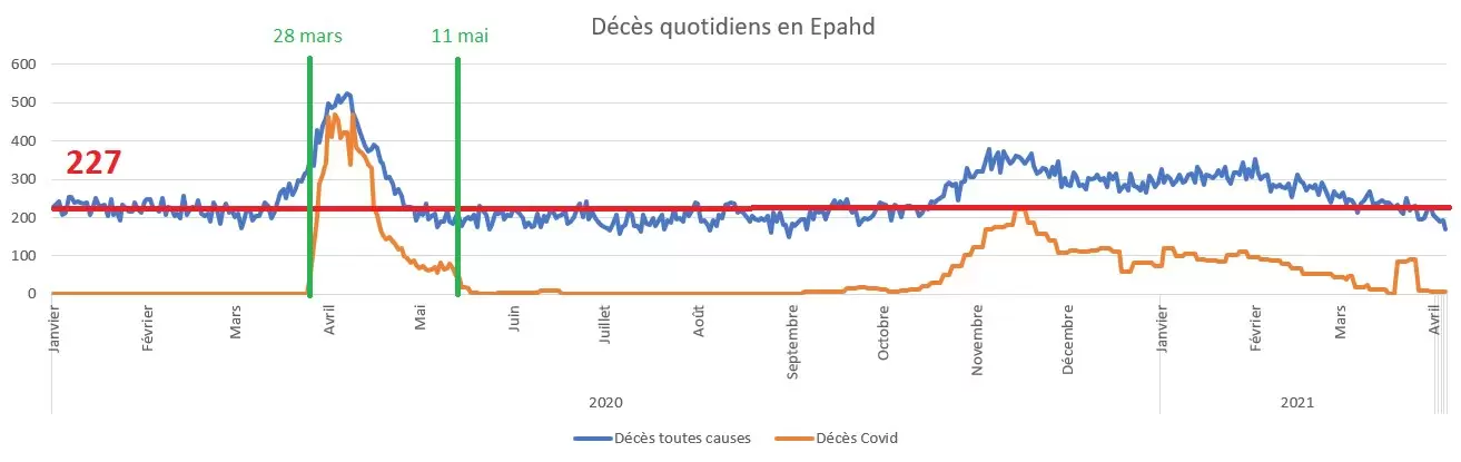 La comparación de las muertes notificadas en Covid 14 y las muertes por todas las causas en EHPAD presenta, por tanto, enormes incoherencias. Se detallan en el vídeo mencionado anteriormente. Por ejemplo, en torno al 31 de marzo, casi todas las muertes en EHPAD se registran en las estadísticas de Covid, mientras que menos de la mitad de las regiones francesas presentan un exceso de muertes y se consideran afectadas por esta patología.