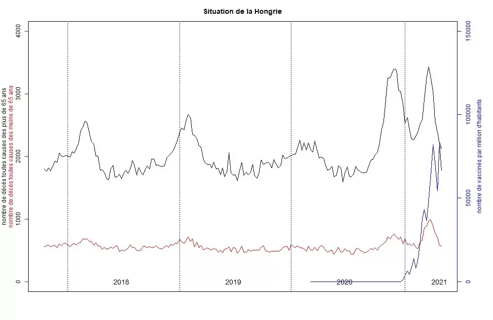 En Hungría, el inicio de la campaña de vacunación contra el virus Covid-19 coincidió perfectamente con un aumento muy pronunciado de la mortalidad, que alcanzó un pico en diciembre para los mayores de 65 años. Para los menores de 65 años, la situación es peor que dos meses antes. Es incluso un récord absoluto para todo el periodo del que disponemos de datos de Eurostat (2013).
