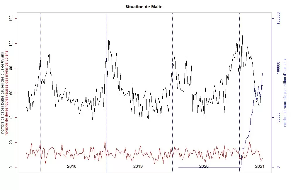 La situación es similar en Malta. El nivel de muertes es significativo en 2021, pero sobre todo, esta vez se trata de personas menores de 65 años. Sin embargo, el reducido número de habitantes de Malta no permite que se reduzca el nivel de los menores de 40 años (en Malta mueren una media de 2 personas menores de 40 años por semana).