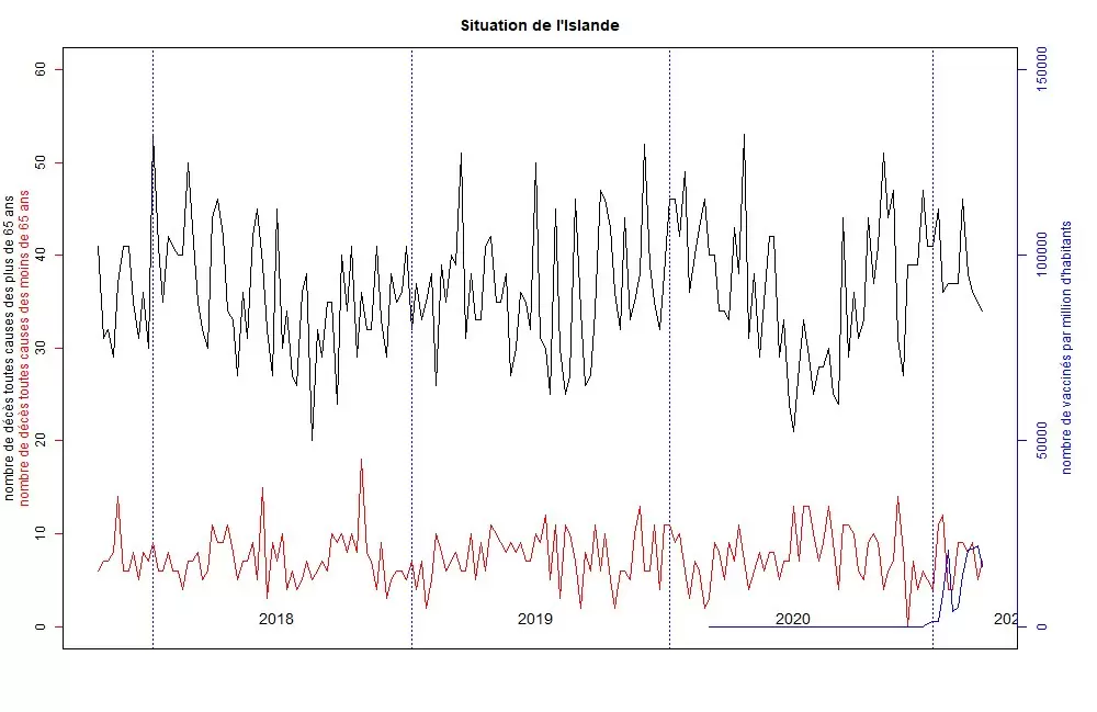En Islandia, un país que no experimentó un episodio de sumrotalidad en 2020, se llevó a cabo una vacunación extremadamente masiva en pocos días. Este pico de vacunación está perfectamente sincronizado con un pico de mortalidad.