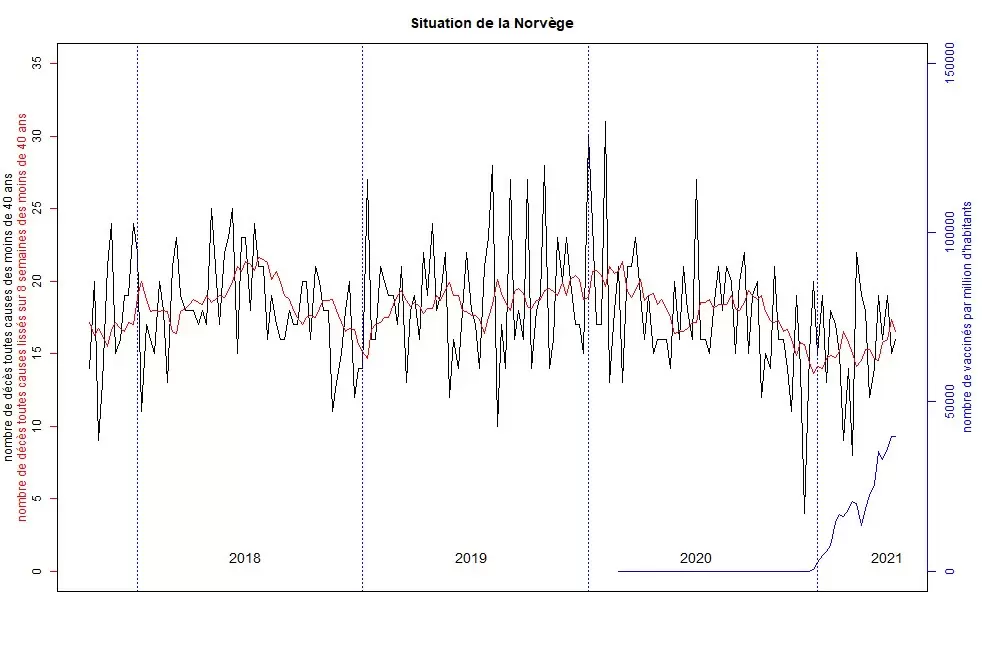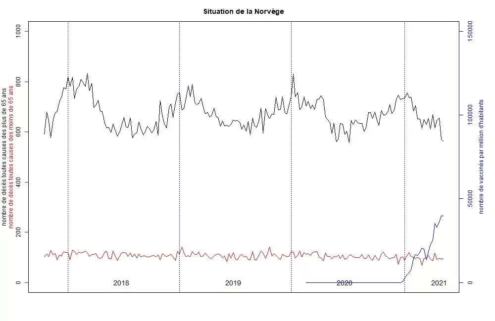 Está abierto el debate sobre la utilidad real de la vacuna antigripal en la mortalidad invernal. Recordemos que esta vacuna no está diseñada como las demás. Es una mezcla que contiene varias cepas de la gripe recomendadas por la OMS. En el momento de la recomendación, no hay ninguna certeza sobre las cepas que circularán durante el invierno. Por lo tanto, es una apuesta. Algunos países, como Noruega y Finlandia, tienen una distribución más baja que otros, especialmente desde la polémica que siguió a la campaña de vacunación contra el H1N1. Sin embargo, Noruega y Finlandia no parecen haber experimentado picos de muertes invernales en los últimos años, sino todo lo contrario. Los datos disponibles sobre las vacunas sólo están disponibles mensualmente, lo que no permite una comparación de calidad con las muertes en Francia. Un alisado semanal de las vacunas distribuidas en comparación con las muertes por todas las causas de las personas mayores de 65 años en Francia (la población más vacunada debido a que las vacunas son gratuitas a esta edad), muestra una proximidad entre estos 2 eventos.