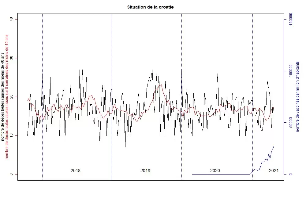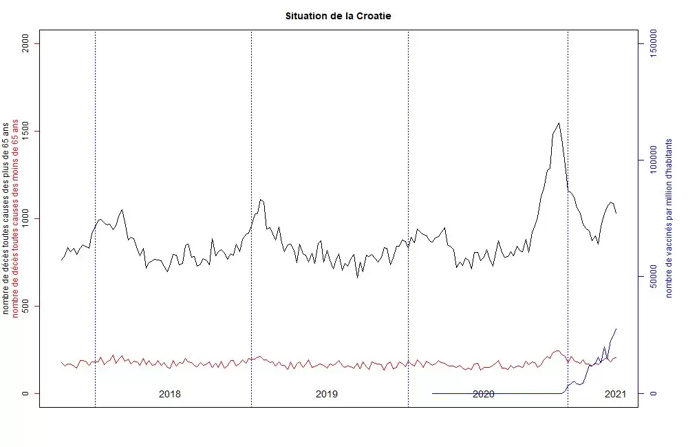 Croacia, al igual que Noruega, no vacunó mucho, pero agrupó la mayor parte de su campaña de vacunación en los mismos días. Se observó un pico de mortalidad al mismo tiempo que la vacunación.