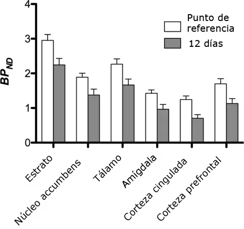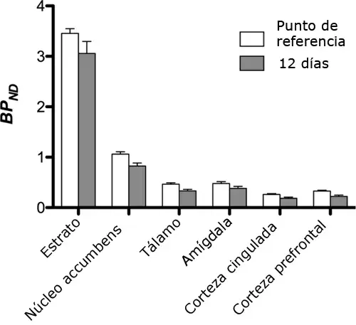 "Después de 12 días de consumo de sacarosa, los potenciales de unión (BPND) de ambos indicadores habían disminuido significativamente en el estrato, el núcleo accumbens, el tálamo, la amígdala, la corteza cingulada y en la corteza prefrontal, lo que es compatible con la menor densidad de los receptores.